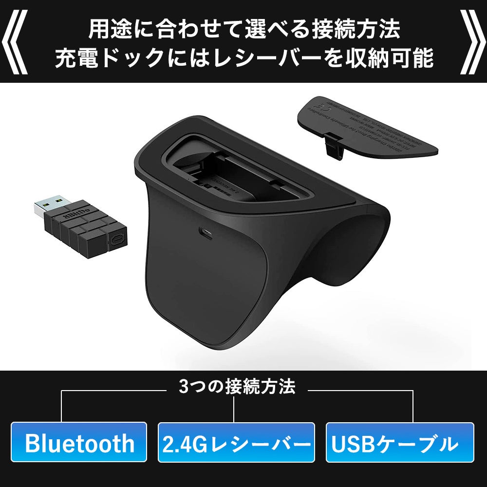 2.4GHz帯USBレシーバーも同様に背面ボタンを切り替え、ドック収納のレシーバを取り出し、Switch側のドックに差し込めば接続完了です。または、レシーバーをコントローラー側ドック内に差し込み、USBケーブルで両ドックを接続するペアリング方法も!USBケーブルによる有線接続は、コントローラーのドックとSwitchのドックをケーブルで接続!いずれも簡単接続でペアリングが可能となっています。