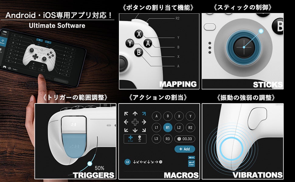 「バイブレーション機能」は、臨場感と操作性に合わせて、強弱調整や機能のON/OFFが可能に。これだけのカスタマイズができれば、ゲームがさらに快適に楽しくなること間違いなし!