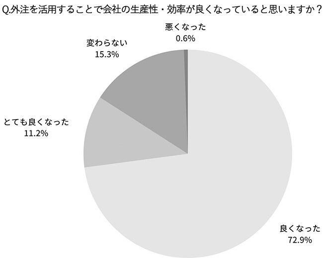 外注を活用することで会社の生産性・効率が良くなっているかという質問には、「良くなった」72.9%、「とても良くなった」11.2%で、合わせると84.1%の人が良くなっていると回答しました。