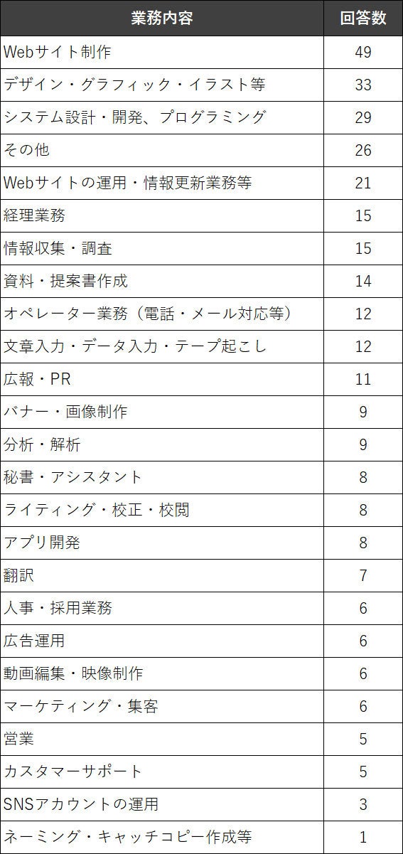 「Webサイト制作(49回答)」が最も多く、「デザイン・グラフィック・イラスト等(33回答)」「システム設計・開発、プログラミング(29回答)」と続きました。