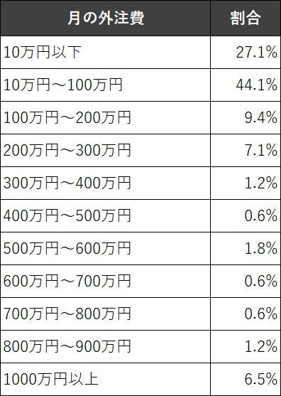 「外注費は月にどれくらい使っていますか」という質問し、10万円以下から1000万円以上の11個の選択肢から回答してもらいました。