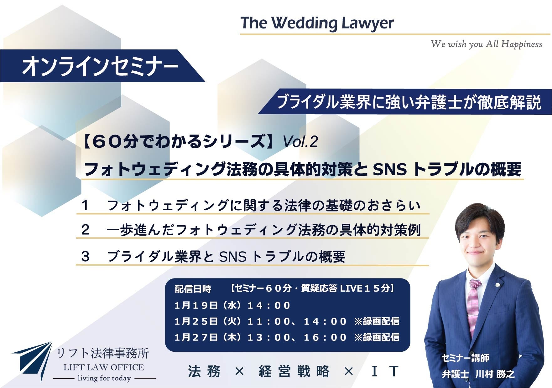 来る令和4年1月19日(水)、25日(火)、27日(木)に『60分でわかる!フォトウェディング法務の具体的対策とSNSトラブルの概要』と題し、The Wedding Lawyerこと、当事務所代表弁護士の川村勝之によるオンラインセミナーを開催いたします。