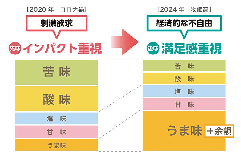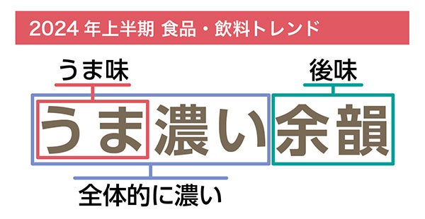 2024年上半期の味覚トレンドは、世界情勢の影響による物価高から消費者は安心感・満足感を求め、「うま濃い余韻」の味わいの人気が高まっている。味わいの骨格をなすうま味が強くなることで、全体の味がしっかりと支えられ、さらにうま味の余韻が強くなれば、満足感も高まると推察される。