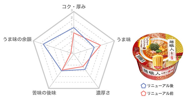 中でもうま味の余韻が大きく強化された日清食品「日清麺職人」のリニューアル前後の味バランスをレーダーチャートに示した。うま味の余韻が大幅に強化され、さらにコク・厚みも強くなっている。塩味に頼った強いだけの味わいではなく、コク・厚みとうま味の余韻によって味わいの奥行きを演出し満足感を高める設計は、おいしさを追究する食品メーカーとしての技術が表れていると言えるだろう。
