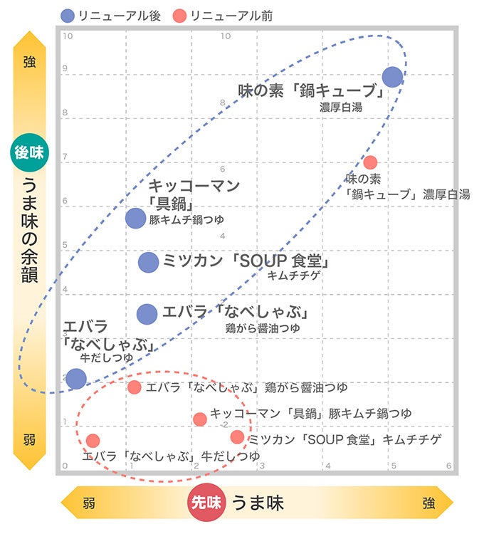 各社のリニューアル商品の味について、うま味とうま味の余韻の変化を図に示した。図の上の方がうま味の余韻が強いエリアであり、リニューアルによってうま味の余韻が非常に強化されていることがわかる。