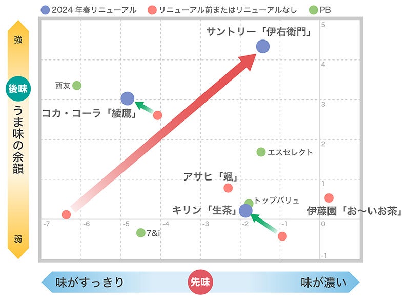 リニューアル後は総じてうま味の余韻が強くなり、消費者に対して余韻の満足感を提案していることがうかがえる。中でも伊右衛門はうま味の余韻に加えて味の濃さも増強され、“味わう”設計としたことで価格に敏感な消費者に訴える高コスパな味は市場商品の空白地帯にポジションを形成し、他ブランドの止渇性を高めた「ライトな味わい」と対照的に、お茶そのものの味を深めた「濃い」味わいの二極化となっている。