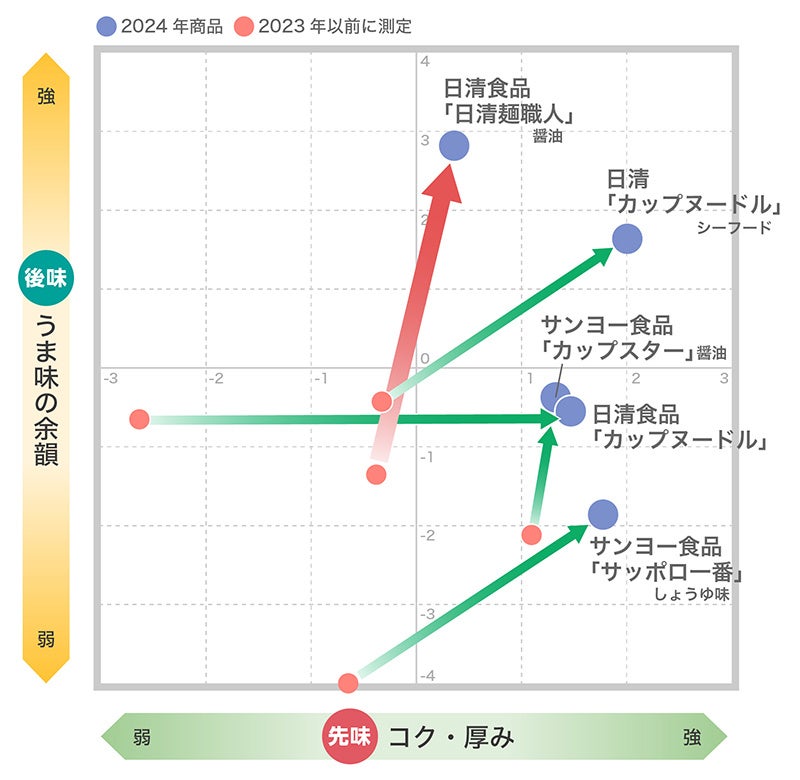 即席麺(カップ)の市場商品について、リニューアル前後の味データを比較した。うま味の余韻に加えて、コク・厚みが増すことで喫食時の満足感が高められると考えられる。各社リニューアル前後の値を見てもわかる通り、うま味の余韻とコク・厚みが強まっており、先味としてのコクと余韻に残るうま味によって、より満足感の高い味バランスに変化している。