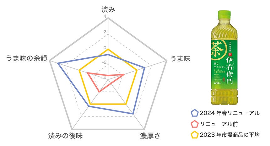 伊右衛門のリニューアルでは、非常に大胆な味の変更がなされた。2023年商品と2024年商品の味データを比較すると、一見して味わいが強化されていることがわかる。特に変化が大きいのは味の濃さ(濃厚さ)とうま味の余韻であり、他商品との比較においても飛び抜けて強くなっている。これにより、少量でも満足感が得られる「うま濃い余韻」のある味わいは、ゆったりと楽しむ“ほっと一息つく時間”を提供するのであろう。