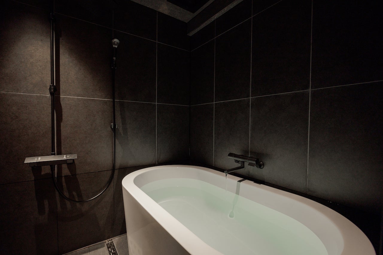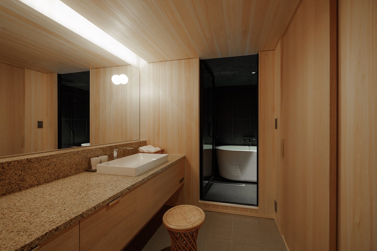 日本旅館である当館が提案する新たな洋室セミスイート。左官仕上げの壁に包まれ、土の中にいるような安心感と落ち着きを感じられる空間になっています。直線を意識した空間構成や、中村拓志氏がデザインを手掛けたTime & Styleの椅子などの家具がモダンな印象をプラス。御影石などの伝統的な和の素材と様式を用いながらも現代のライフスタイルを紐解いてつくられたコンテンポラリーな空間が、非日常の豊かな時間を提供します。温泉旅館の過ごし方をアップデートできるお部屋づくりを目指しました。
