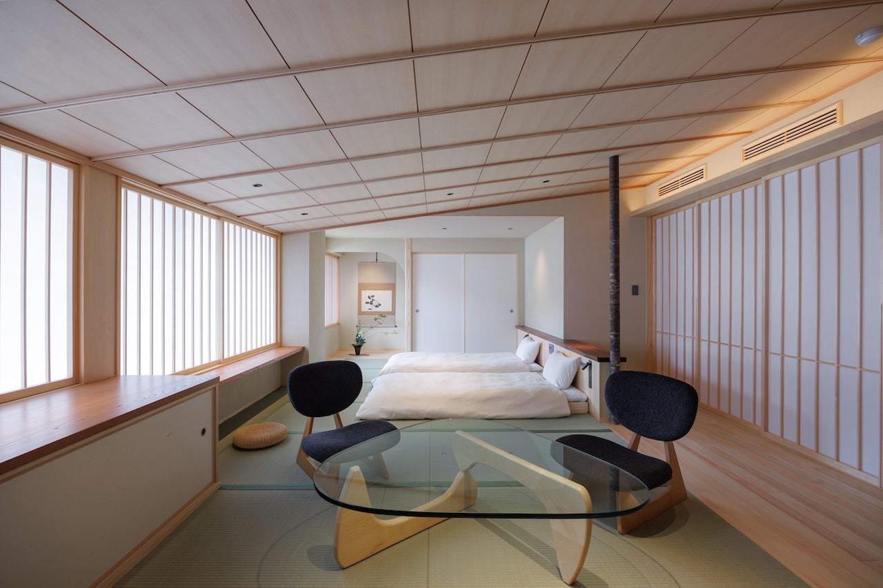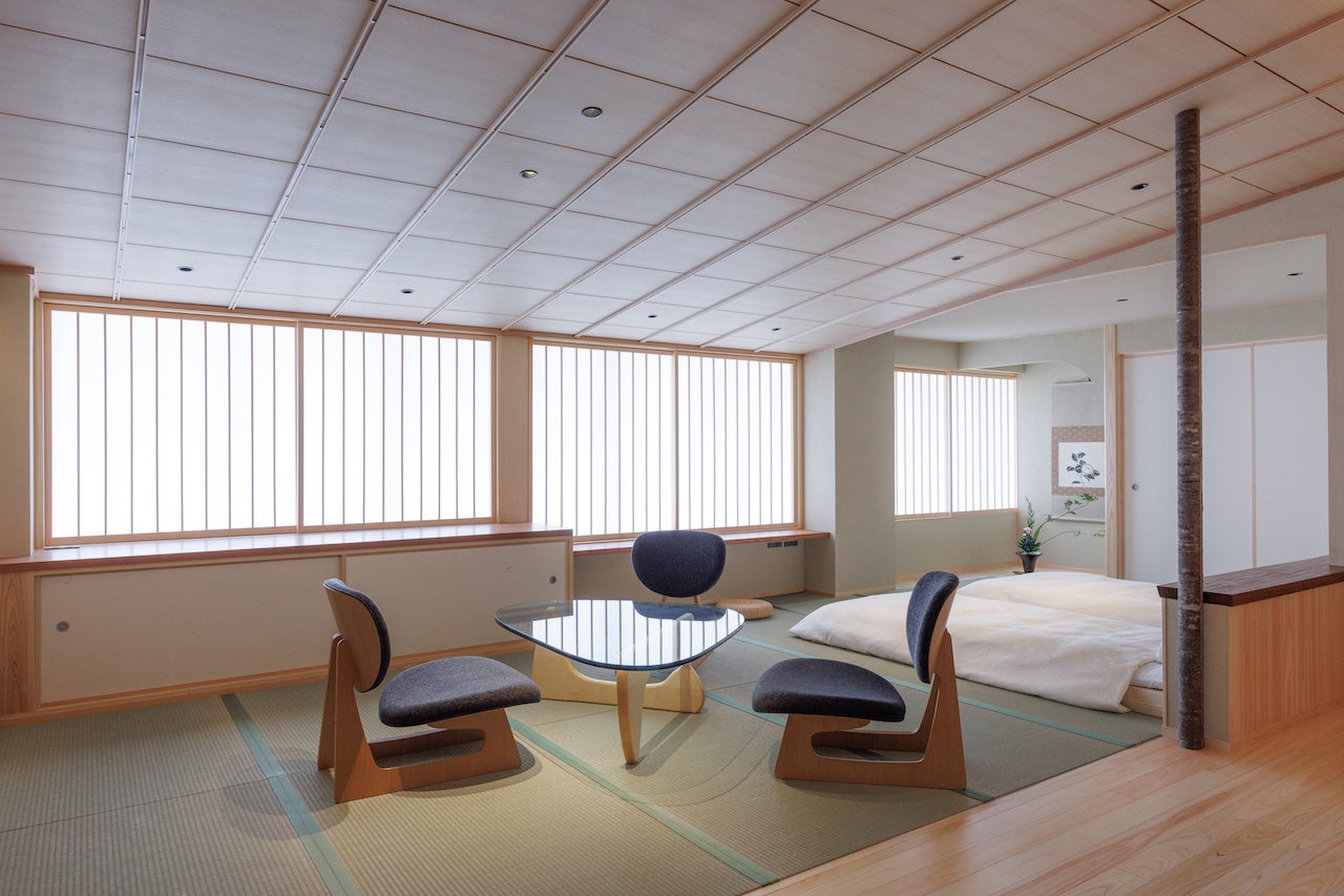 下がり天井が茶室を思わせる上質な佇まいの和室セミスイート。天童木工の低座椅子やイサムノグチのテーブルなど、モダニズムの名作家具を配し、和の中にモダンの要素が散りばめられています。土・紙・木・洋式、和を感じられる自然の素材・様式にこだわり、静謐な空間に設えた温故知新スタイルのお部屋です。当館が提案する新しい和の空間が完成しました。