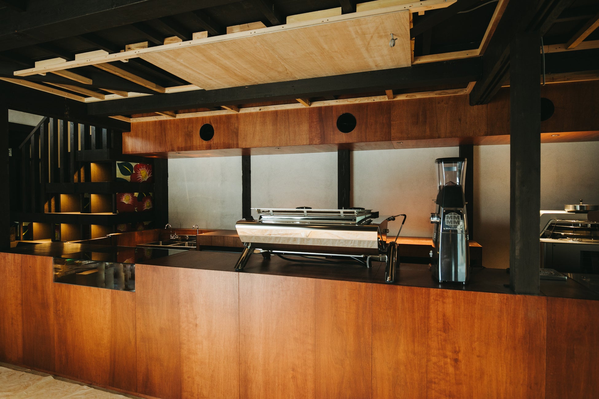 エントランスで出迎えるのは、オランダに本社がある「Kees van der Westen(キース・ファン・デル・ウェステン)」のエスプレッソマシン。メニューはエスプレッソを使用したドリンクに加え、「球磨川アーティザンズ」のコーディアルシロップを使用したクラフトコーラや、旬の果実を使ったシーズナルドリンク、ドリンクとのペアリングを楽しめる和菓子などを予定しています。また、店内で自家焙煎も行い、シングルオリジンや同店オリジナルブレンドの珈琲豆を提供します。
