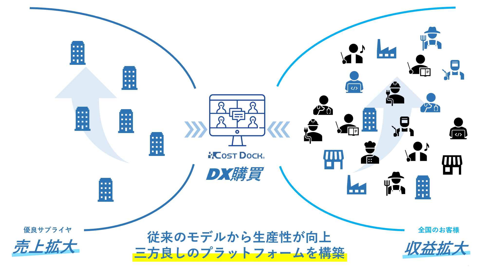 それをコストドックではオンラインで仕組化する事で、販売する側のコストと、購買する側のコストも減らし、またサプライヤ側にも売上を上げて、安い原価を購買する側に提供できる「三方良し」の仕組みのプラットフォームを構築する事ができました。
