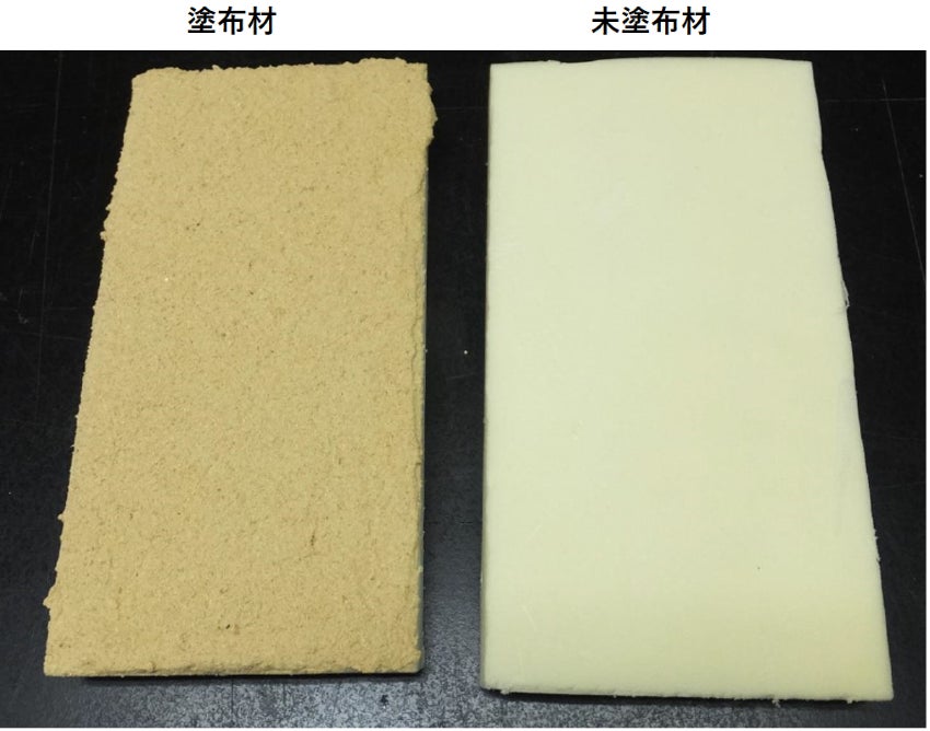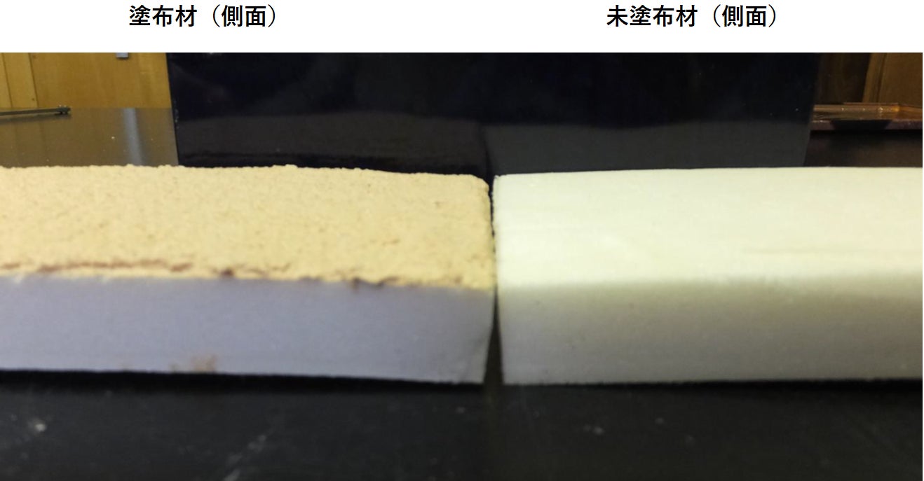 さらに、一般的な木粉の特長でもある、吸水性や消臭性、断熱性などもあわせもっているため、安全、健康、快適な住環境を実現できるサステナブルな建築資材と言えるでしょう。この不燃木粉の塗り材を発泡ウレタンに塗布し、乾燥させた試験材の燃焼試験を行い、合板の防炎基準に合格する難燃性能を確認しました。