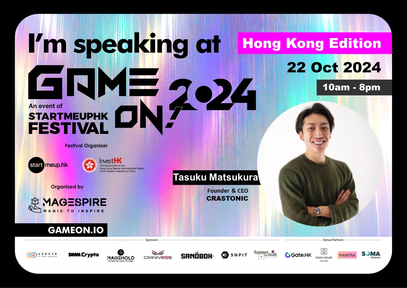株式会社CRASTONIC(本社:東京都港区、代表取締役:松倉 翼、以下「当社」)は、ブロックチェーン・AI技術とゲーム、アート、音楽、エンターテインメントの融合をテーマに開催される国際カンファレンス「GameOn! 2024 Hong Kong」において、代表の松倉がスピーカーとして登壇することをお知らせいたします。