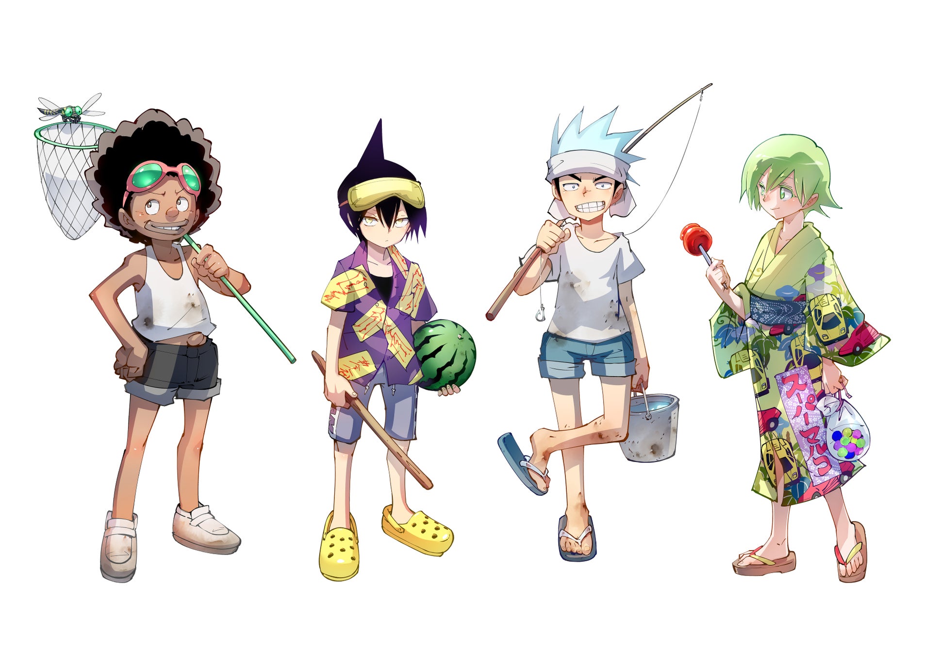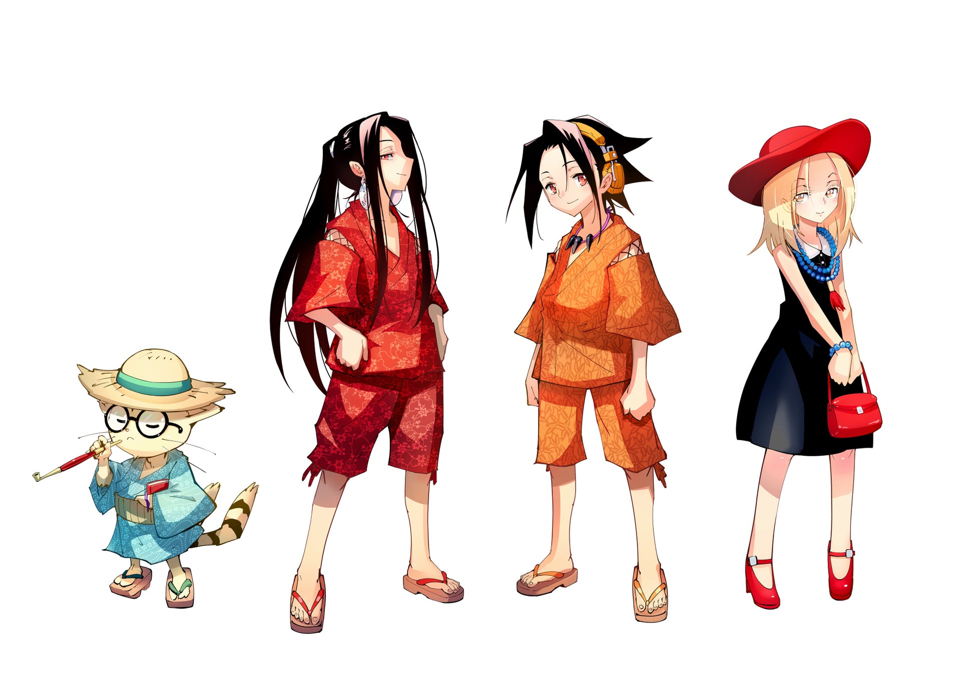描き下ろしイラスト「神の国出雲の三巫女」をはじめ、夏休み仕様のファッションに身を包んだキャラクター達を使用し、定番のアクリルスタンドをはじめ暑い夏の旅に最適なSHAMAN KINGエナジードリンクなど、様々なグッズを出雲限定で発売!