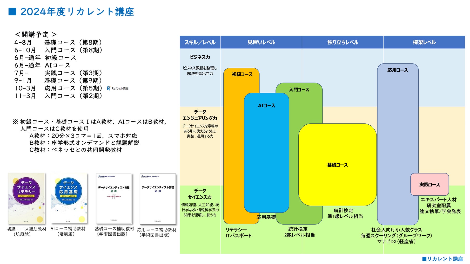 数理データサイエンスに係る国内トップレベルの大学の講義と、実際にデータを扱う実習を、今回認証を受けたリカレント教育の他、公開講座、出前授業及び教材開発として提供しています。