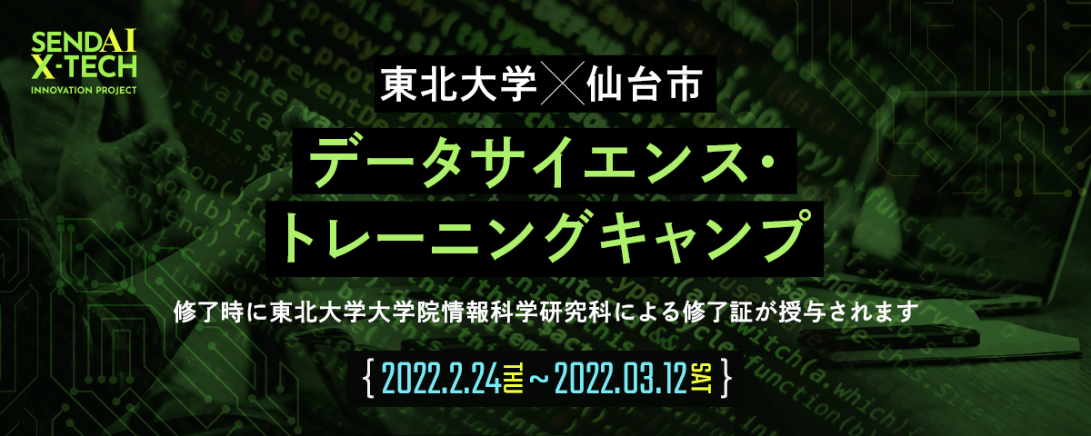 仙台X-TECH推進事務局(所在地:宮城県仙台市、事務局長:竹川隆司)は、AI関連ビジネスを持続的に生まれるエコシステム“AI-Ready都市・仙台”を目指す取り組み「仙台 X-TECHイノベーションプロジェクト2021」の一環として、東北大学 大学院情報科学研究科と連携し、AIを用いたデータ分析の手法を学び、データサイエンスの実践スキル習得を目指す「データサイエンス・トレーニングキャンプ」を開講することをお知らせいたします。