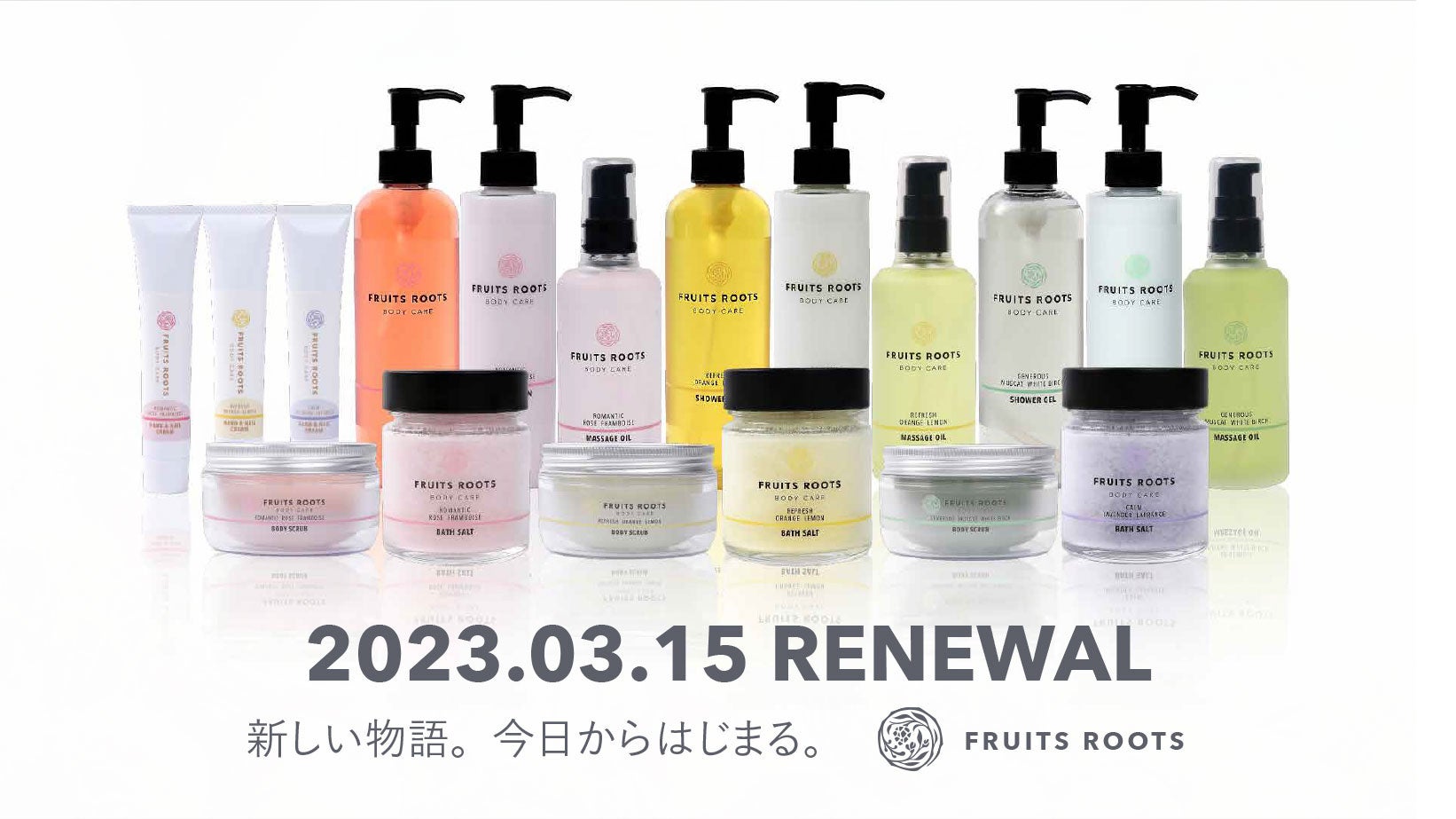 国産オーガニックコスメ「フルーツルーツ」の販売とエステサロンを運営する株式会社 ES-ROOTS(本社 : 東京都目黒区、代表取締役 : 榎戸淳一)は、2023年3月15日、ブランドリニューアルをいたしました。ブランドロゴタイプを変更、コスメ製品のパッケージデザインを全面リニューアル、香りシリーズについては既存の香りが装いも新たに生まれ変わりました。ブランドのイメージや表面的な見た目は変わっていきますが、フルーツルーツが大事にしている製品づくりの考え方は一切変わりなく、これからブランドとしてのグローバル化を推進して参ります。