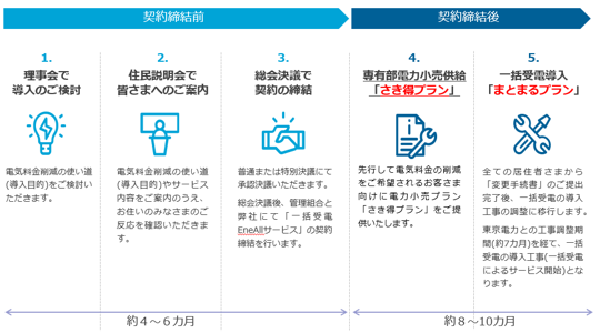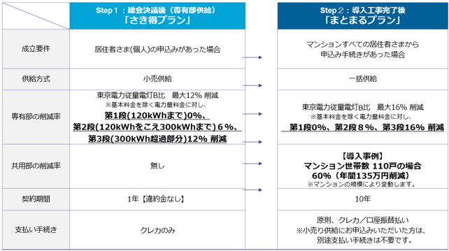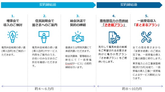 ①の導入までには、全戸のお客さまからの申込書の回収に加えて、電気設備の導入工事により、約8〜10カ月かかるため、関東エリアの総会決議後のマンションにお住まいでご希望のお客さまを対象に、一括受電導入に先んじて、より早く専有部の電気料金がお得になる「さき得プラン」の販売を開始します。