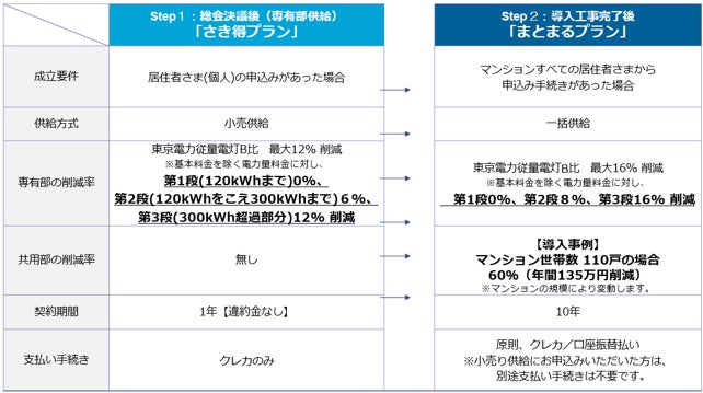 中央電力株式会社(本社:東京都千代田区、代表取締役社長:丹治 保積)は、関東エリアのマンションを対象※2に、①共用部の電気料金削減に加えて専有部は電気使用量に応じて割引率が上昇し、250kWh/月以上の電気使用で業界最安水準※1になる「まとまるプラン」と、②一括受電導入に先駆けて割安に電気を使える「さき得プラン」※3を本日より販売開始します。今回併せて、『マンション一括受電サービス』※4の名称を『一括受電「EneAll」サービス』に名称変更します。