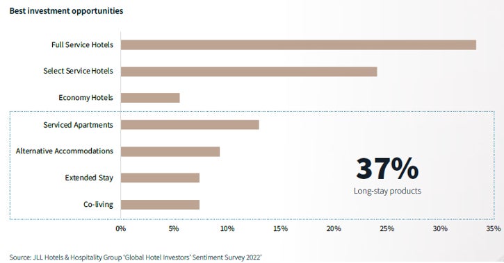 2022年に大手不動産サービス業者Jones Lang LaSalle (JLL)がグローバル・ホテル機関投資家を対象に行ったアンケートによると、37%の回答者が長期滞在型の宿泊施設を「最も良い投資対象」に選びました。(対して従来のフルサービスホテルを選んだ回答者は33%でした)