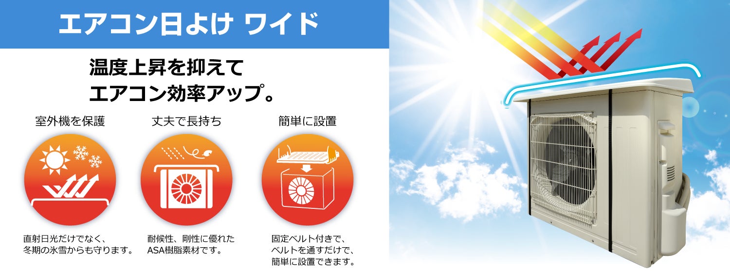 今年の猛暑は『エアコン日よけ』で温度上昇を抑え、エアコン効率アップ!直射日光によるエアコン室外機の過熱を防止できる『エアコン日よけ ワイド』。