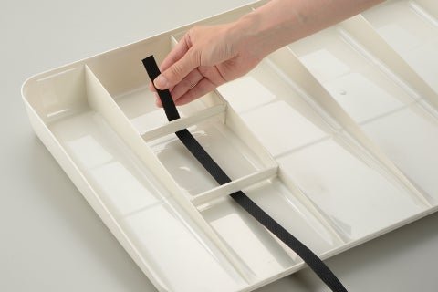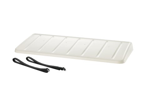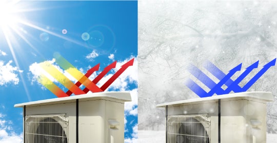 「エアコン日よけ ワイド」の素材は耐候性、剛性に優れた建築材にも使われるASA樹脂製で、長期間使用できます。取り付けは固定ベルトを、ベルト通し部に通し、室外機に固定するだけで簡単に設置できます。猛暑の直射日光による室外機の過熱を防止し、エアコンの効率運転につながるアイテムです。