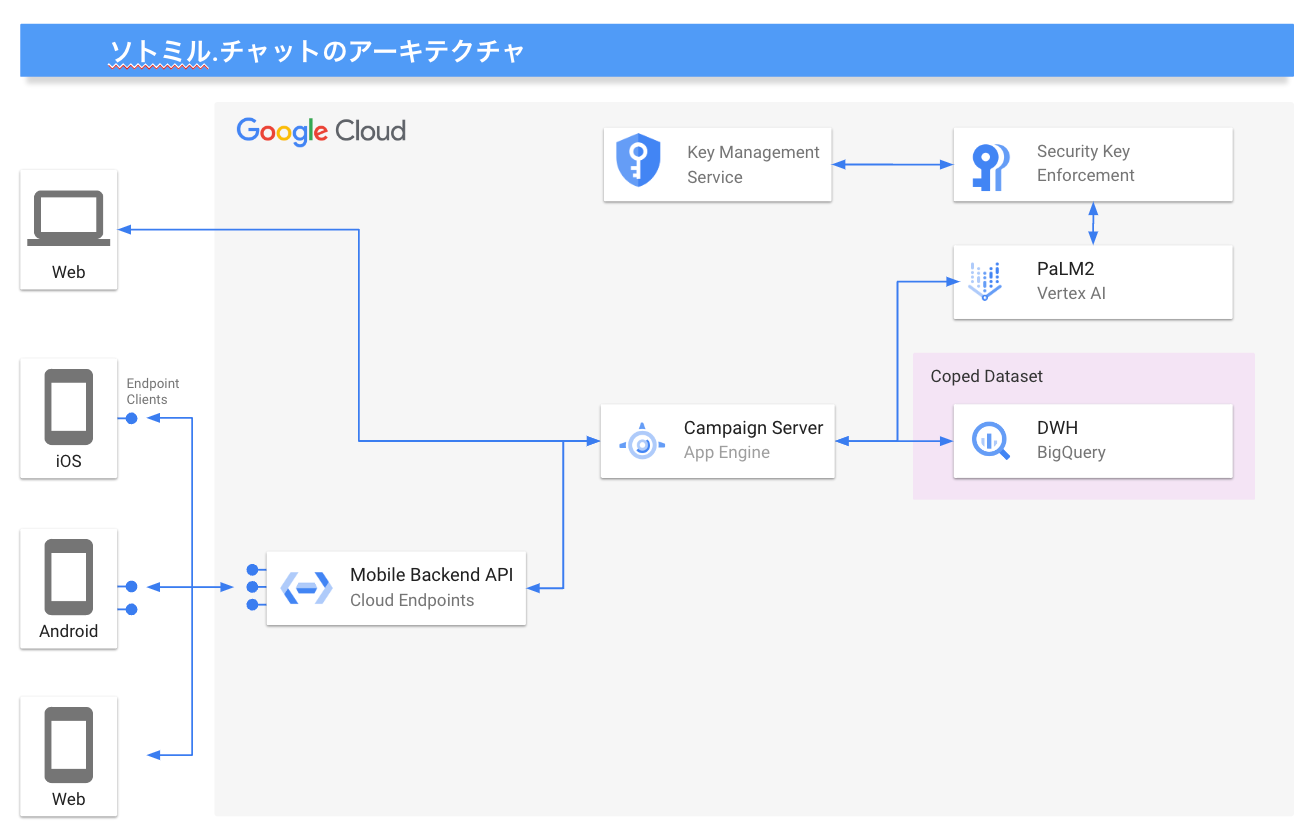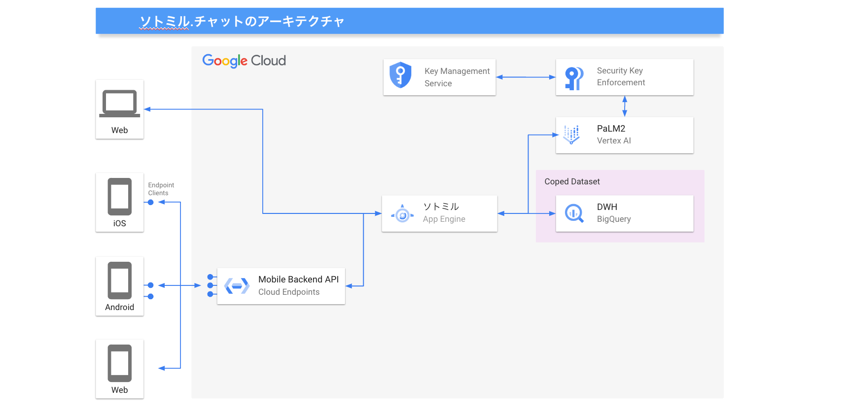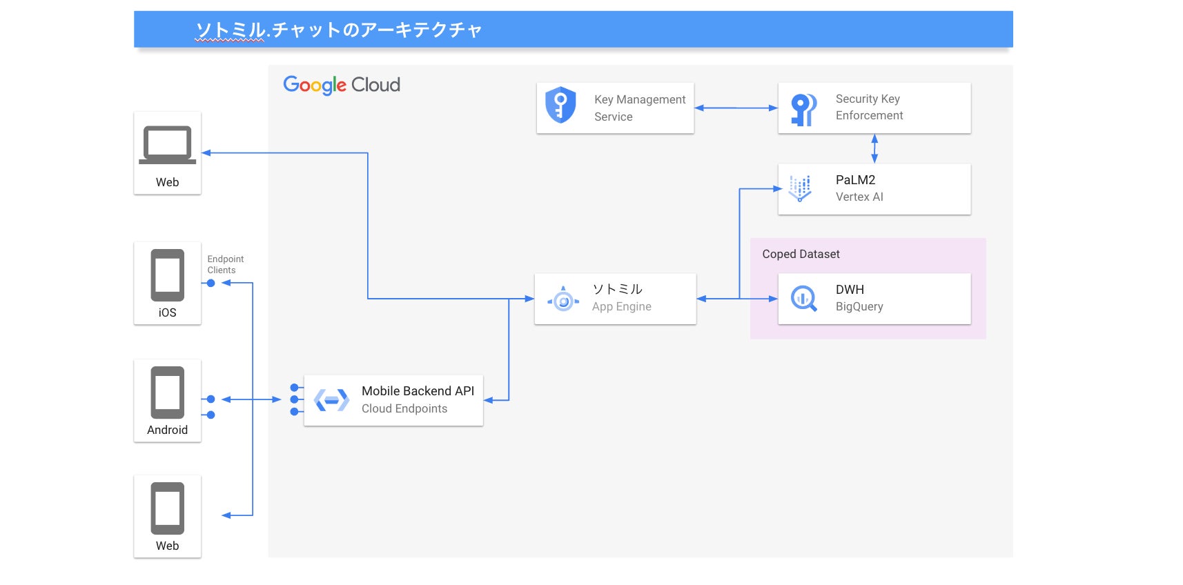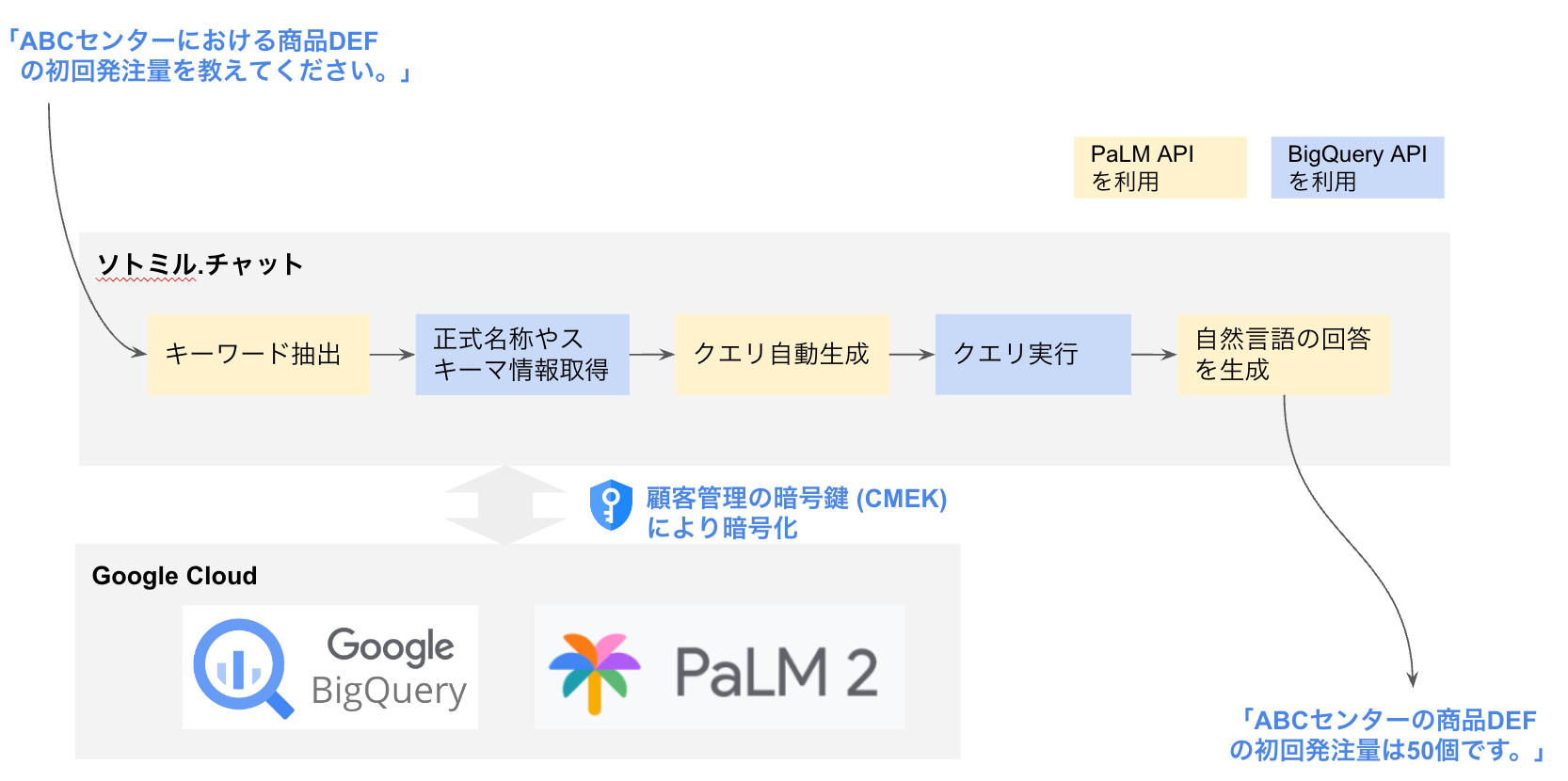生成AIの基盤モデルには Google 社の PaLM2 を利用しており、質問を含むすべてのデータは暗号化され基盤モデルに入力されて応答が生成されます。また、PaLM2 が社内DB に直接アクセスすることはなく、アプリケーションを介して社内DB にアクセスするためのクエリを発行します。基盤モデルのトレーニングにデータが使用されることはありません。