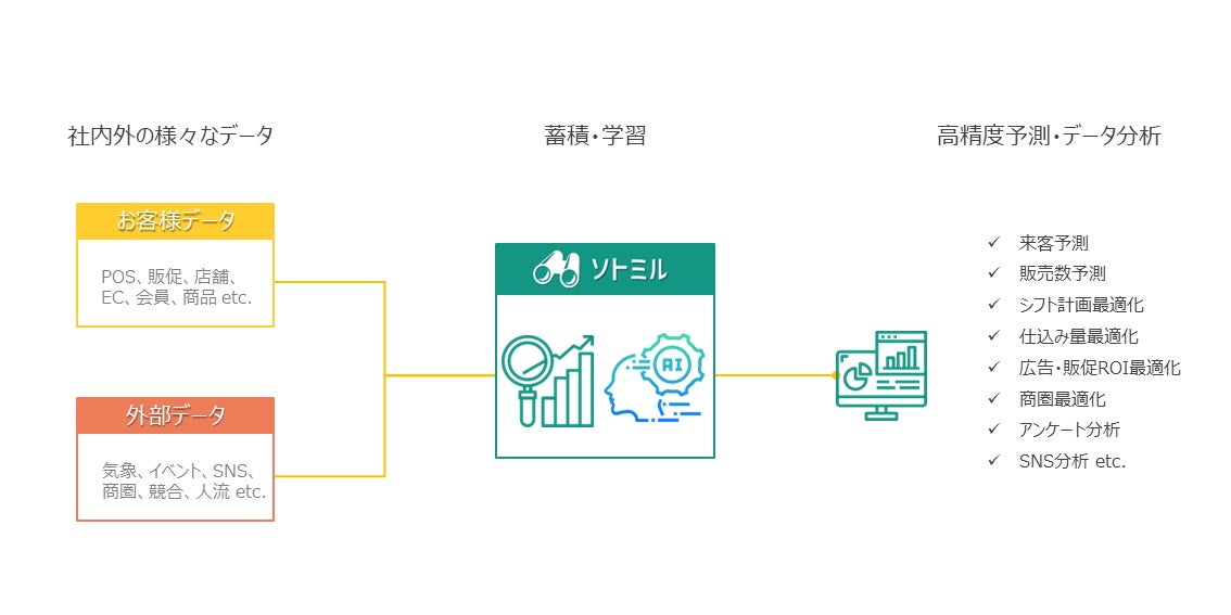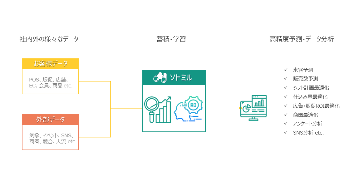 ソトミルは、社内外の様々なデータをリアルタイムに取得・蓄積し、高精度の予測と分析を行うサービスです。