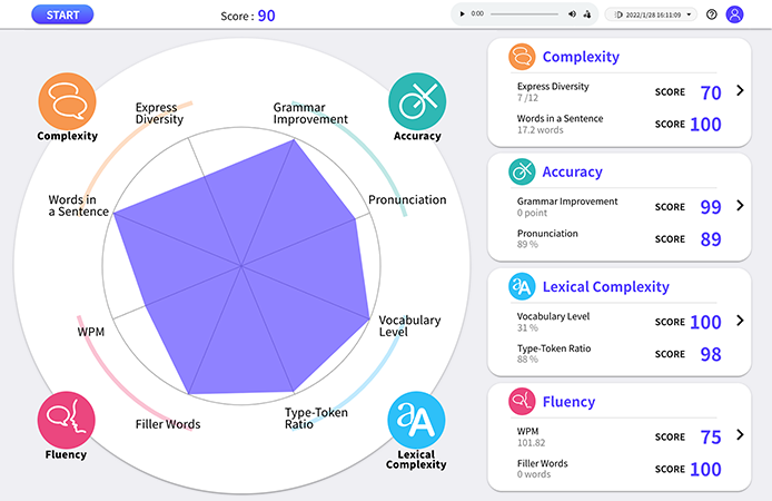 ・発話内容が「正確性」「統語的複雑性」「語彙的複雑性」「流暢性」の4つの観点、8項目で分析され、ダッシュボードで結果を可視化することができます。