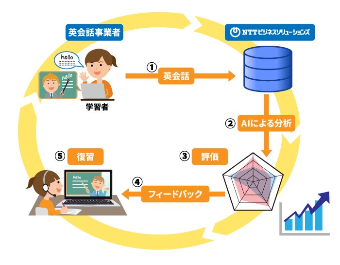 NTTビジネスソリューションズは、新たな学びの世界を具現化するスマートラーニングの取り組みとして英会話学習者へのアンケートやヒアリングを通じ、「自分の発話内容の振り返りが不十分で効果的な復習ができていない」、「学習効果を客観的に把握できない」といった英会話学習における課題を把握しました。このような課題を解決するAIを用いた英語発話分析ツール開発しました。同時に、教育機関や個人向けのオンライン英会話学習サービスを提供するQQ Englishにおいて英語発話分析ツールを用いた本トライアルを実施します。