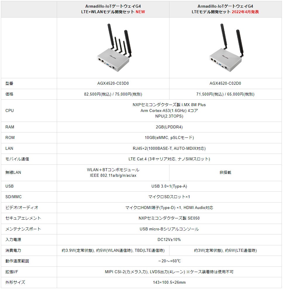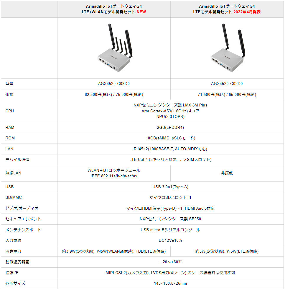 Armadillo-IoTゲートウェイG4 LTE+WLANモデル 開発セットの主な仕様