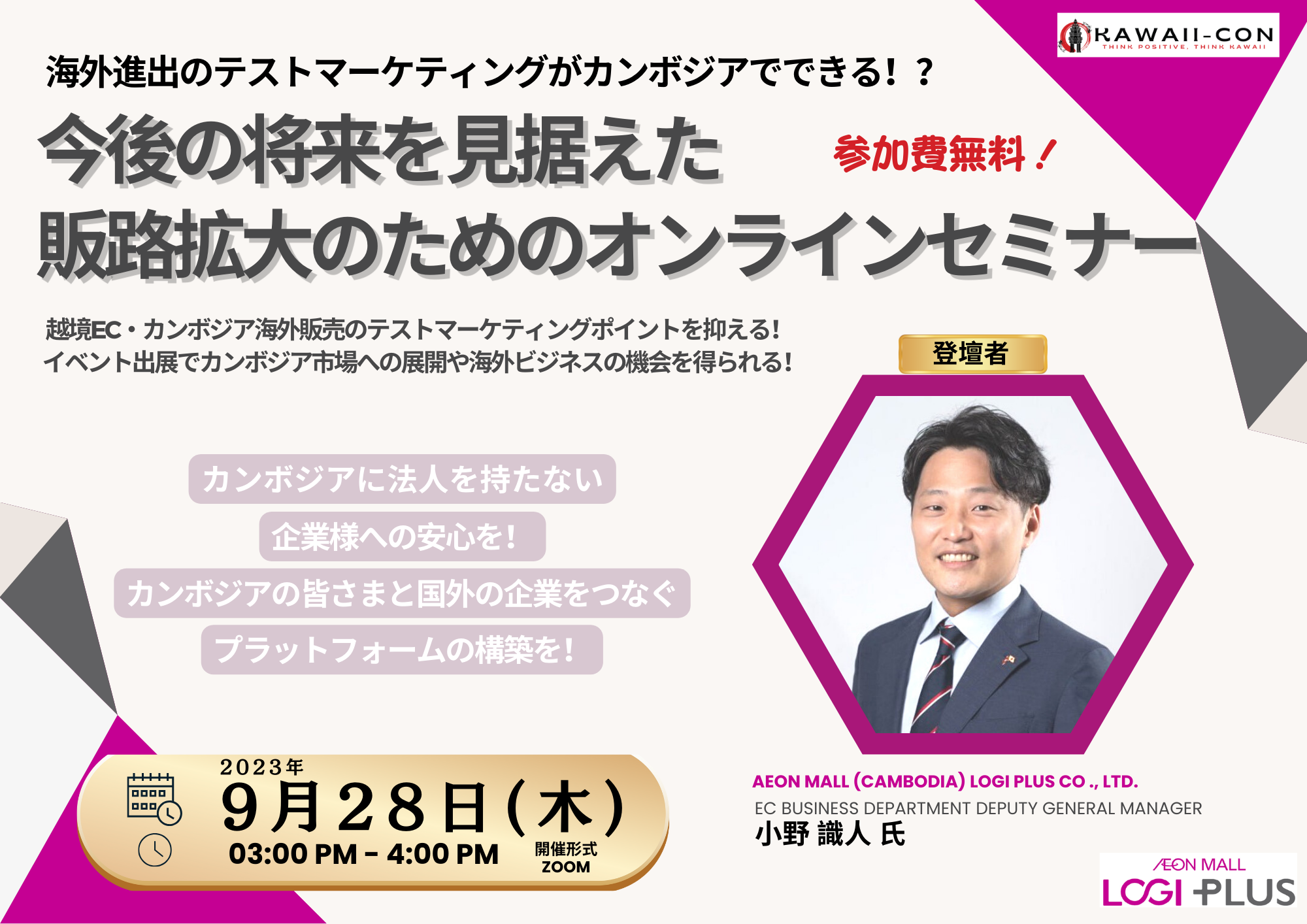 セミナー当日は、法人がなくても海外進出の第一歩を踏み出し、テストマーケティングがカンボジアで可能な機会についてご紹介します。 さらに、より気軽にテストマーケティングが可能となる場として11月10日〜12日開催するイベント「KAWAII-CON」についてお伝えします。カンボジア市場やアジア展開への展望を持つ企業にとって、 このセミナーが新たなビジネスチャンスを提供する場になると確信しています。