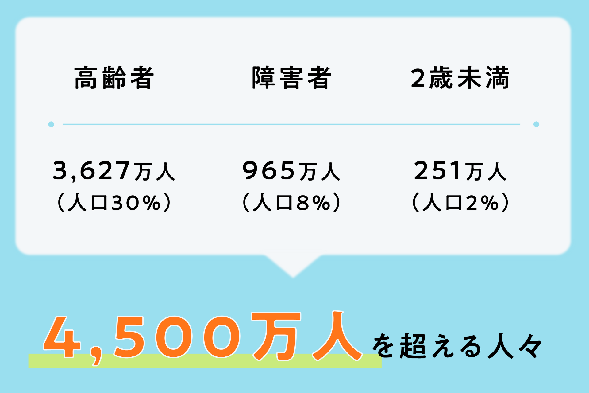 また事故や病気で障害を負うケースも多くあります。更に高齢者の人数3,627万人、2歳未満のこども(ベビーカーを必要とするこども)251万人以上を含めると、バリアフリー情報サイトから発信する情報が、4,500万人を超える方々の悩みの解決に繋がる情報であるとも言えます。