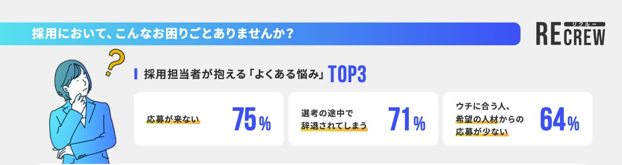 リクルー(RECREW)、採用活動を再構築をするようなコンサルティングサービスのご提供も可能なので、中小企業の経営者、人事担当者で採用活動の効率化にお悩みの方はぜひリクルーをご検討くださいませ。