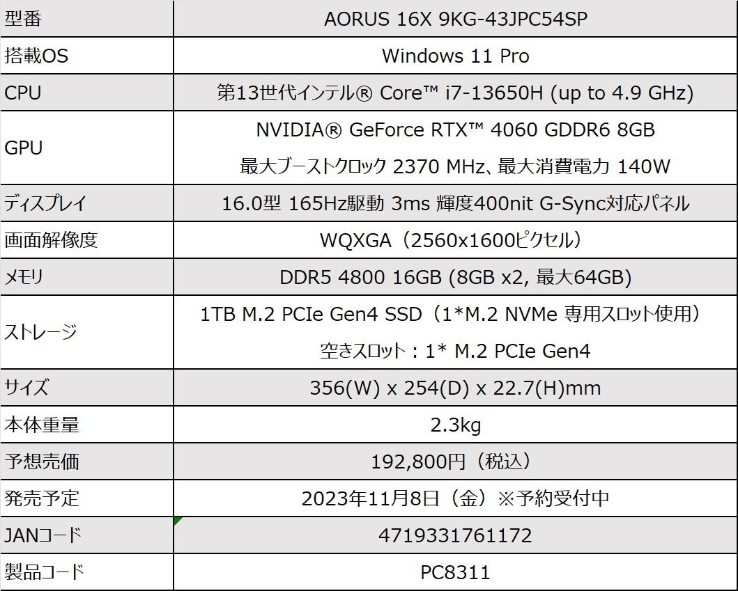 メーカー製品情報 https://www.gigabyte.com/jp/Laptop/AORUS-16X--2024
