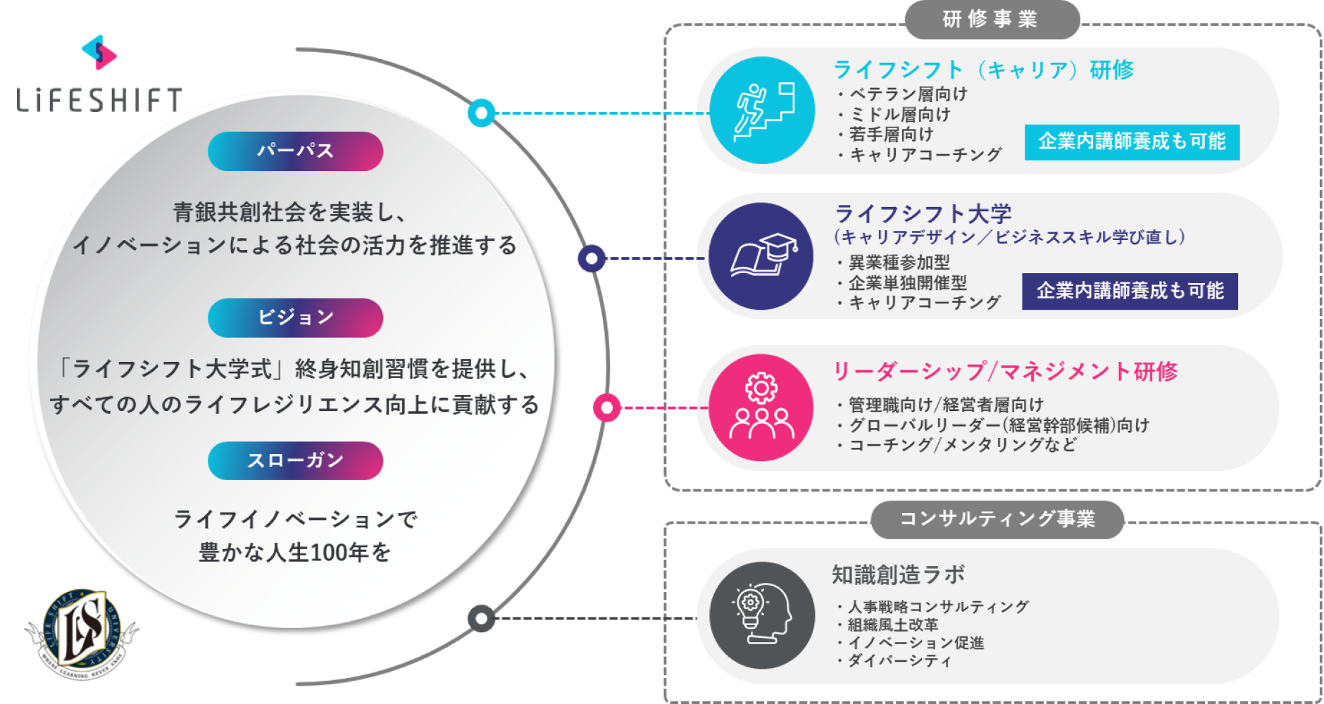 ・主な事業:企業研修/ミドルシニア層活躍に向けた組織・人事コンサルティング/社会人向け専門校ライフシフト大学運営