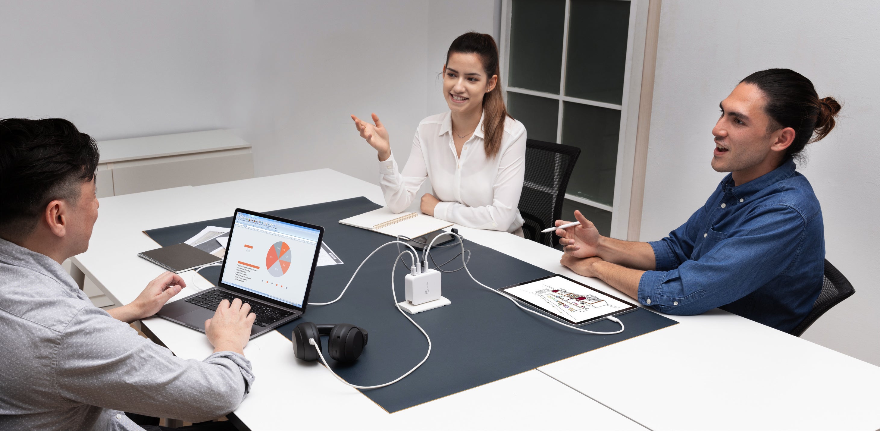 窒化ガリウム(GaN)搭載しているため、130Wでコンパクトなサイズを実現しています。更に折畳みプラグの設計により、かばんに収納して便利に持ち運びできます。一つの電源プラグで4機まで給電できるため、電源タップの使用口数を節約できて、複数の充電器を持つことなく、これ一台で十分です。日常使用はもちろん、出張や旅行にも最適です。