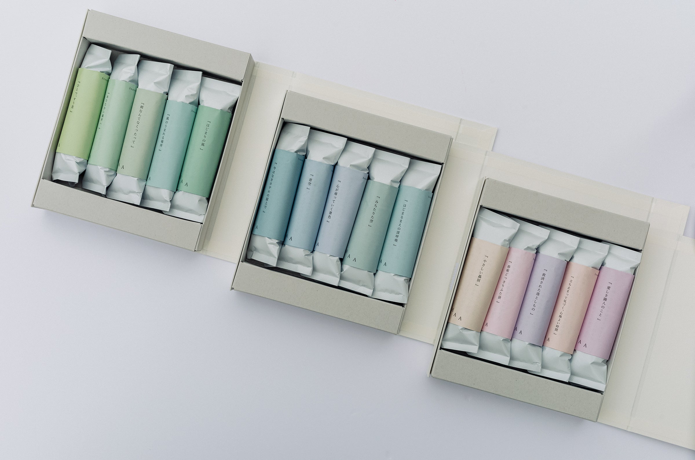 贈る気持ちを代弁する3つのテーマに合わせた「ことばに包まれた入浴剤」5個入りのギフトボックスです。入浴剤は全て同じHAA for bath(無香料)で、包み紙に書いてある言葉が全て異なっています。ギフトで受け取った方がそっと本棚から取り出せるようなデザインで、それぞれのテーマに合わせたパッケージでご用意いたしました。