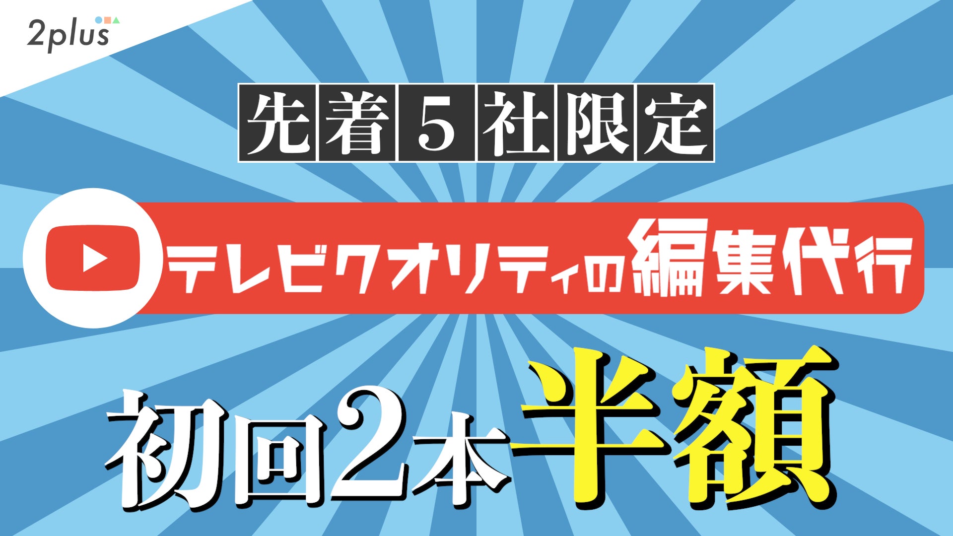 テレビ番組制作、PR事業などを行う株式会社2plus(本社:福岡県福岡市、代表取締役:山田浩貴)は、テレビ番組制作のノウハウを活かした『動画編集代行サービス』を開始いたします。また、サービス開始に伴い「初回お試しキャンペーン」を先着5社様を対象に実施いたします。ぜひこの機会に、テレビ番組クオリティの編集代行をお試しください。