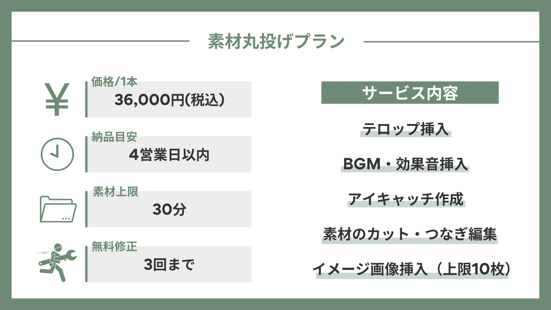 | 【初回お試しキャンペーン 概要】 ■キャンペーン対象 ・カット済みプラン 25,000円→12,500円(税込) ・素材丸投げプラン 36,000円→18,000円(税込) ■対象本数 ・2本まで ※無料修正対応は各1回 |
