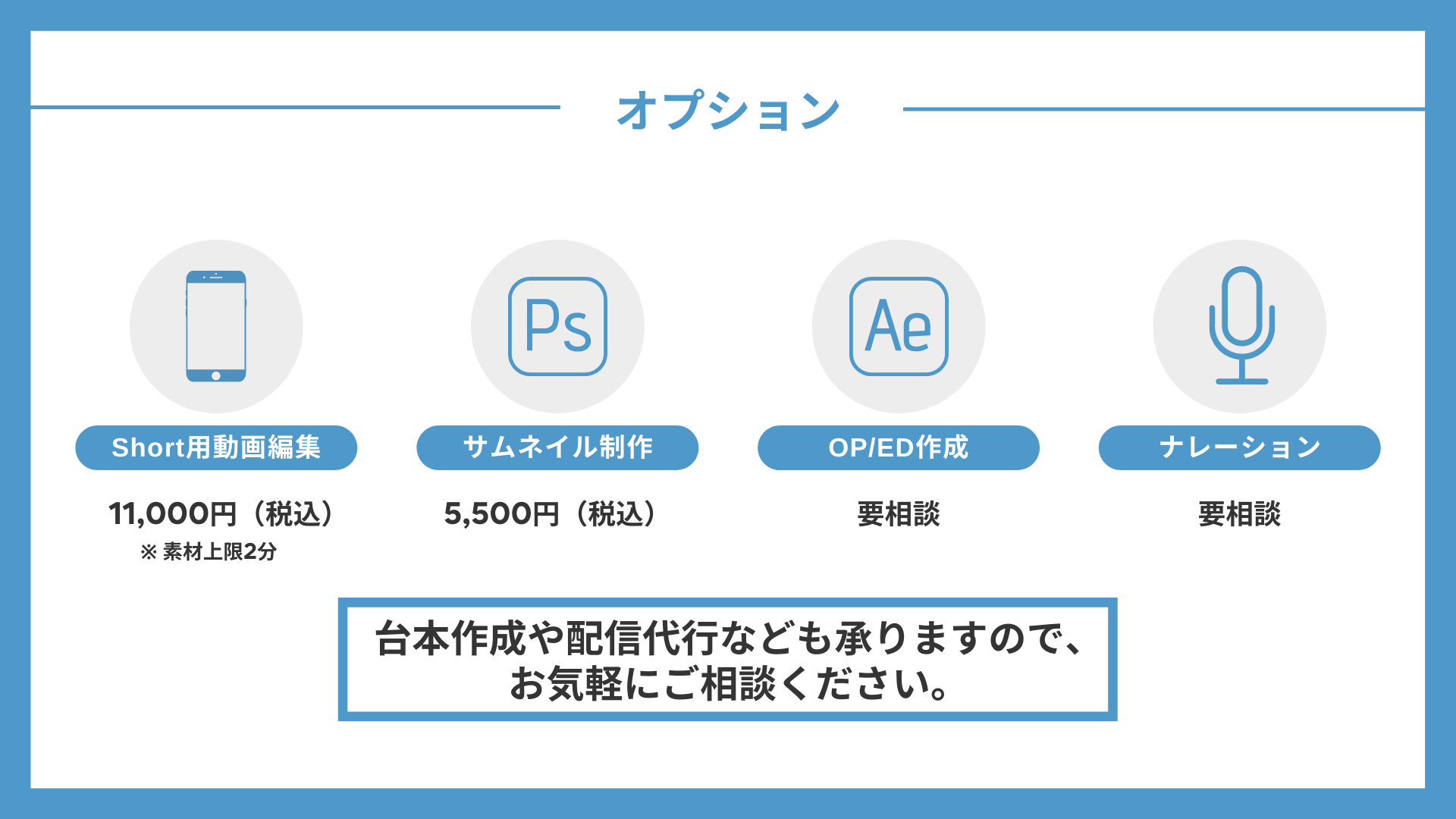 この他にも、企画立案・撮影・編集までを一貫して行うプランや、Short動画編集、サムネイル制作なども対応しております。