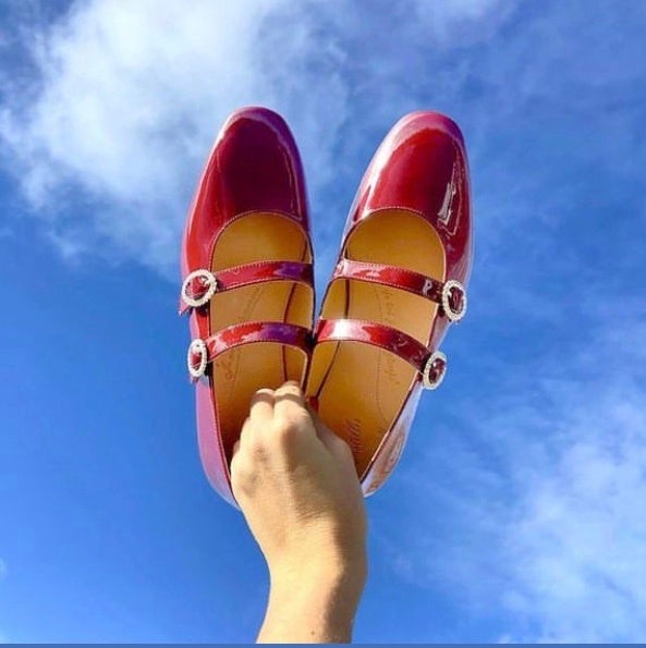黒のパテントのボディに、甲のストラップが1本のタイプと2本のタイプ、そして、バーガンディのパテントのボディに2本のストラップのタイプ, どれも、バックルには、ビジューをあしらいましたので、フラットシューズではありますが、エレガントに着用いただけますので、これからの季節、オケージョン用にも着用いただけます。