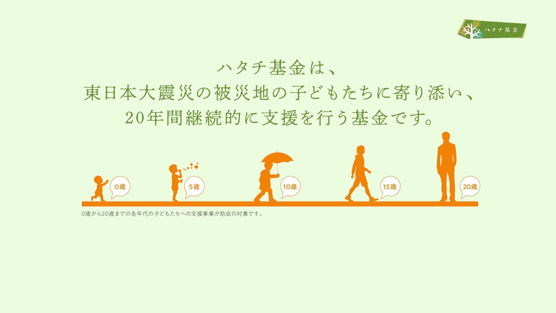 「東日本大震災発生時に、0歳だった赤ちゃんが無事にハタチを迎えるその日まで」というコンセプトの下、東日本大震災発生直後から20年間継続的に、被災地の子どもたちに寄り添い支援を行う基金です。2024年3月に設立から13年目を迎え、残りの活動期間は7年となります。東北被災地で活動する団体が、ハタチ基金活動期間終了後も子どもたちを持続的に支え見守れるように。助成という形で支援を行い、長期的に活動ができるよう後押しできるよう活動しています。