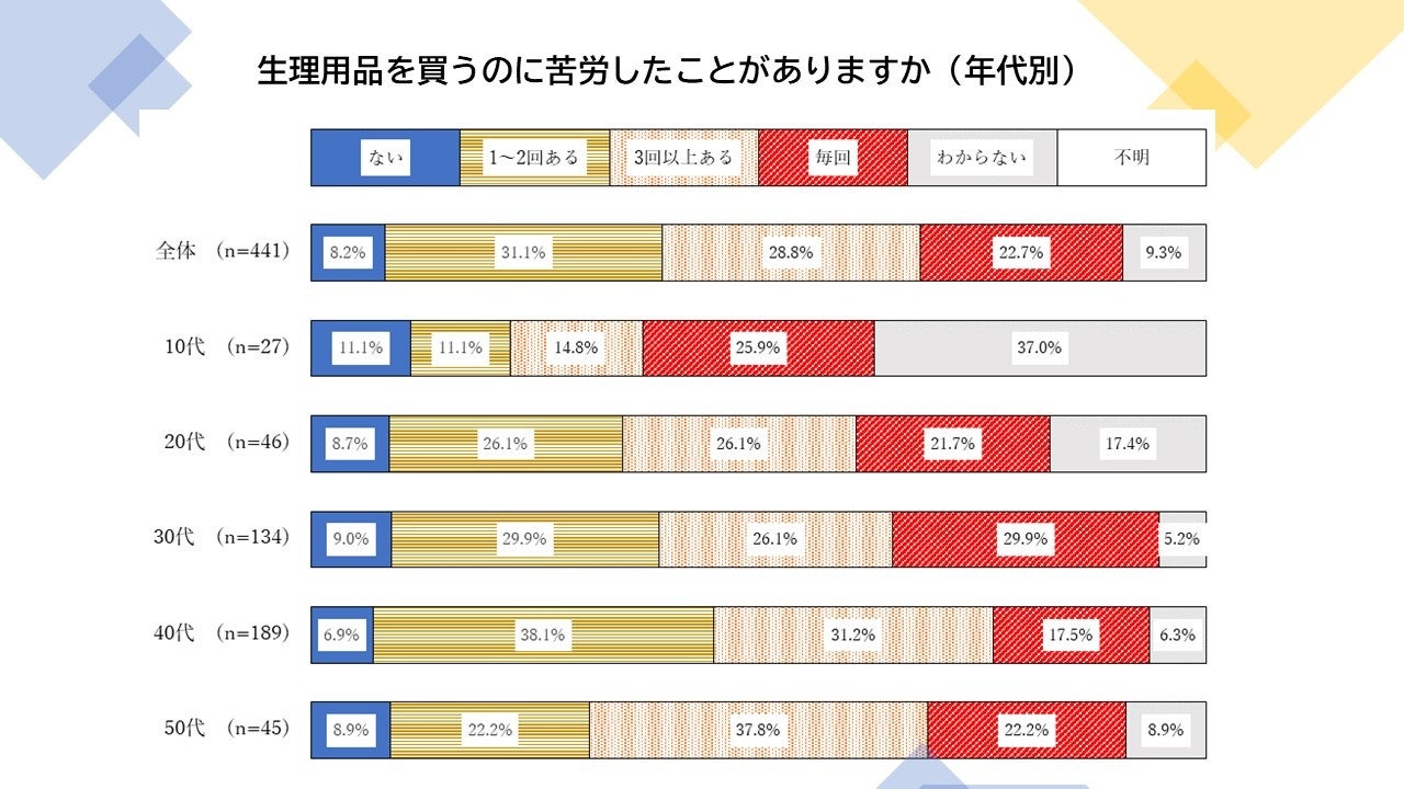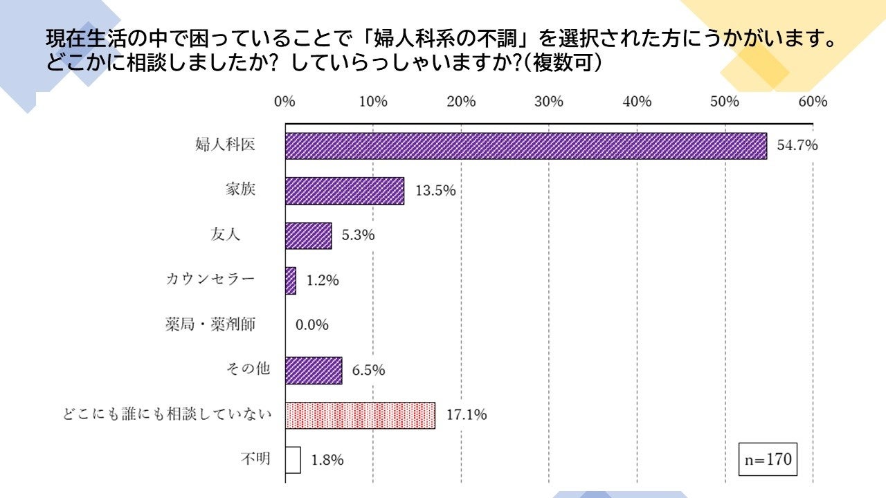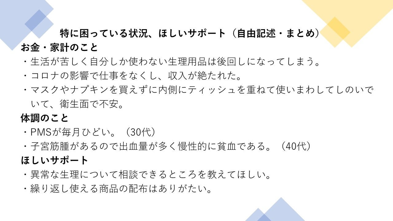 昨年度実施したアンケートでは、生理用品の購入に苦労したことがあると答えた方が8割に上りました。また、ホルモンバランスの乱れなど生理の不調についてのコメントも多く寄せられました。しかし約2割の方が、「どこにも誰にも相談できていない」と回答しています。