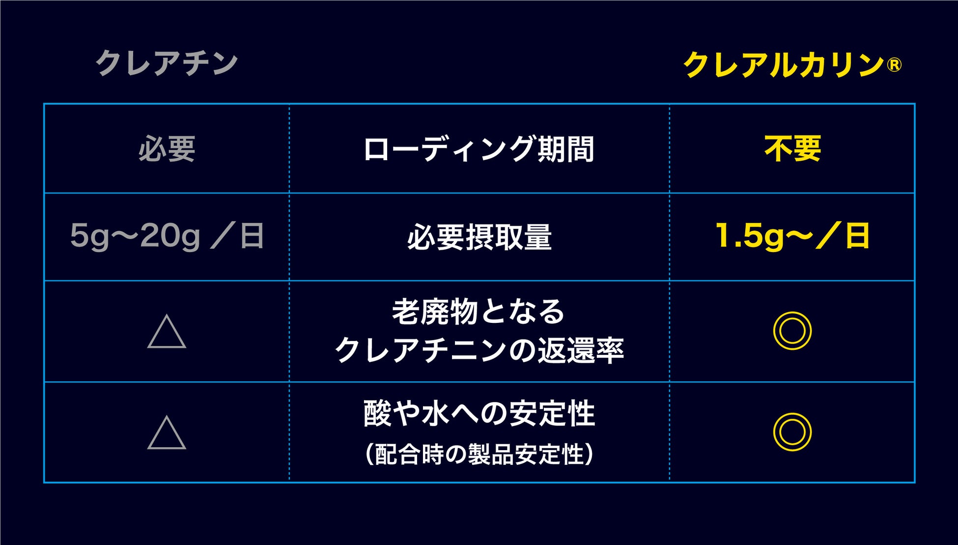 クレアルカリン®は胃酸の影響を受けずに体にやさしく「クレアチン」として吸収。多量の水やローディング期間を必要とせず、安定した量(1.5g/日)を摂取することができます。