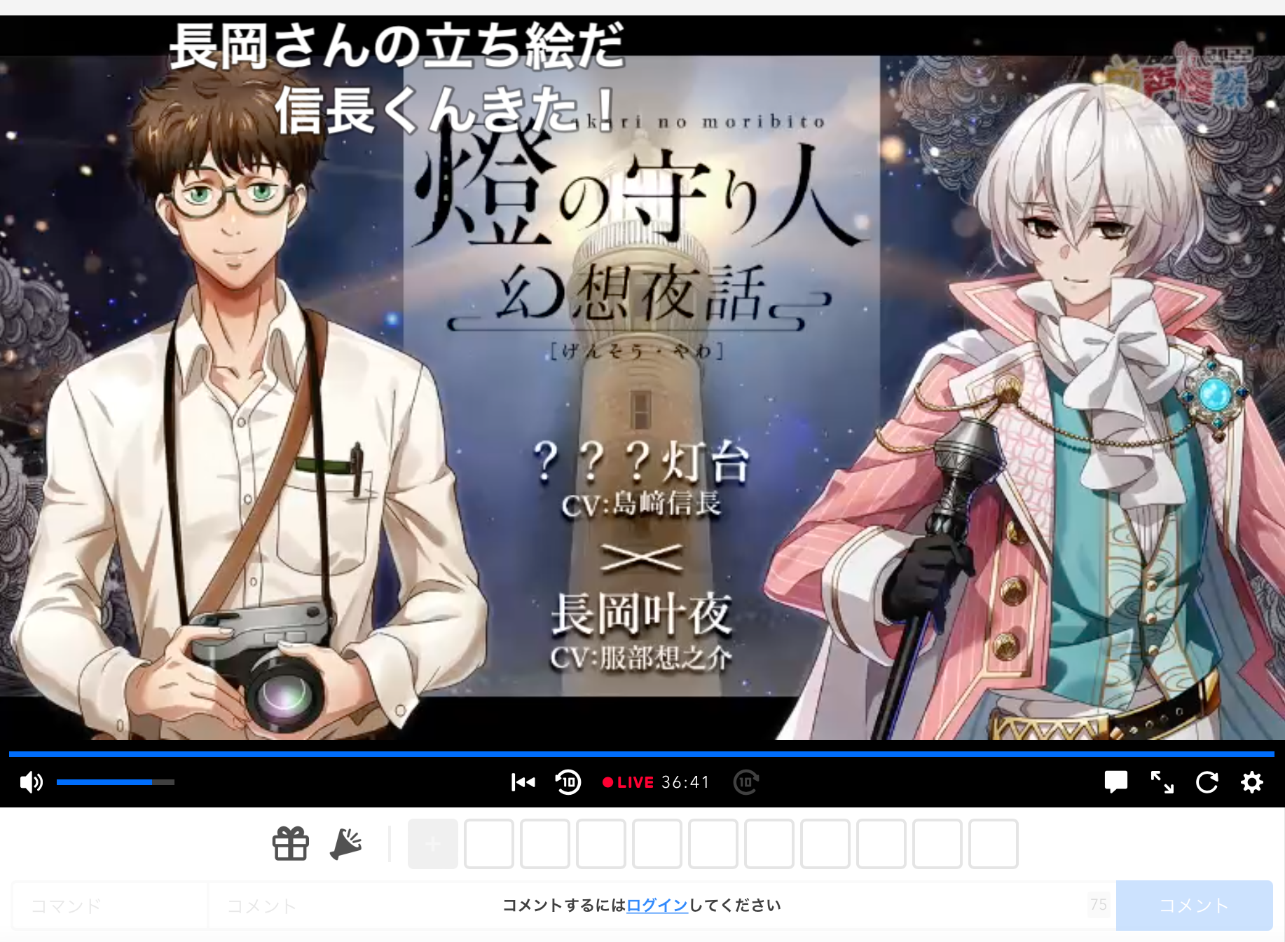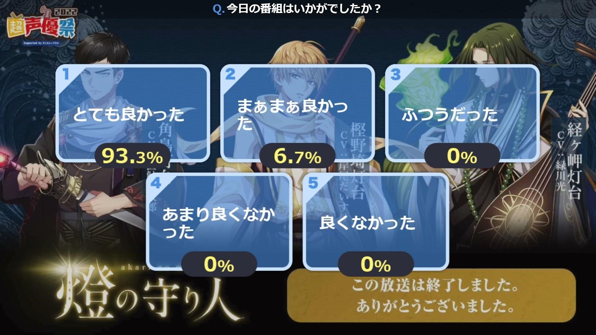 日本最大級の“声優”特化型イベント「超声優祭 2022」にて、全10回の配信を行いました。イベント時までに配信されていた『燈の守り人~幻想夜話~』22話の全話配信に加え、過去のエピソードにあたるボイスドラマを初公開配信。さらに、昨年に有料配信され話題を呼んだ「〈声劇〉明治開国編」を特別に無料配信しました。