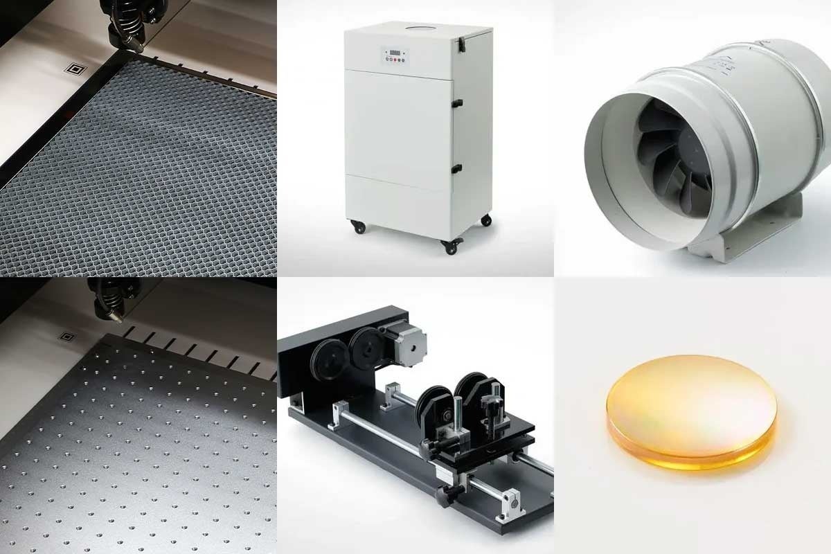 HL650R/HL650は加工を手助けする様々なオプション・周辺機器を用意しています。煙や臭いを排気する排気ファン・集塵機をはじめ、円柱・円錐状の加工に対応した回転軸、より刻印に特化した集光レンズ、加工ベッドに取り付けるハニカムテーブル・ピンテーブルなど、使用用途に合わせてお役立てください。