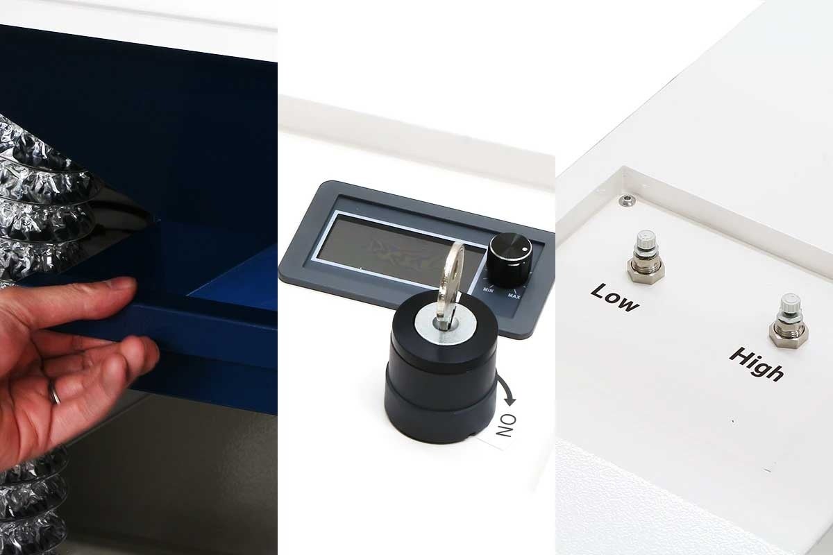 刻印・切断加工に応じてエアーの風量を調整できるデュアルエアアシスト、PCを接続しなくても加工を行えるコントローラ、加工ゴミを簡単に捨てれるダストボックス、外部信号から加工をスタートできる外部IFなどなど、その他にも便利な機能を搭載しています。