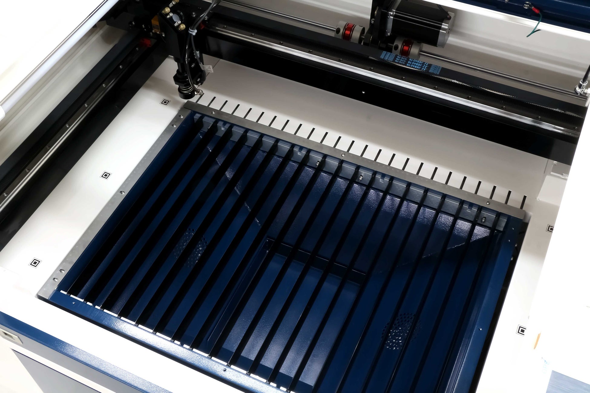 レーザー加工機の仕様上、レーザーヘッドと素材の距離を常に一定に保つ必要があります。従来の製品では手動でこの距離を調整していましたが、HL650R/HL650は加工ベッドの高さ調整機能が搭載されているため、ボタン一つで調整が可能になりました(手動での調整も可能)。